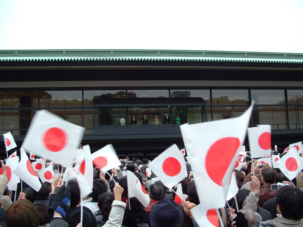 emperor, (the nice gentleman waving) saying hi to the plebs, who was dutifully waving the flags it got at the entrance. my first emperor!! some guy next to me wearing a towel all twisted up and around his shaved head (first time for me to see j-ultra-nationalists) was shouting 'banzai!' about 27 times till the emperor and his whole family vanished behind the ricepaperwall again. all very exciting. i wish i could host the short videoclip somewhere i took standing admidst a sea of red suns on white, waving, doing a 360 while being very tall. if you saw it you'd know what i mean. then, onwards to ginza, which is as expensive as everyone tried to tell me (cafe au lait= 840yen=A$11=11SFr.) whoa! so no coffee in ginza then, fine! and just up and down in a few equally expensive department stores for wihch ginza is famous. marvel at how much people are willing to pay for a purse with an embroidered name on it, check out the lacquerware, which really is amazing, love that stuff, the ceramics section is always worth a look but we couldn't find the groceries section, bummer. i wanted to see $20 chocolate with my own eyes. oh well, next time.