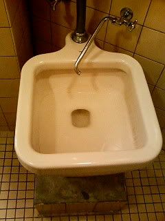 interesting contraption! it's not an urinal, cos there was 2 urinals in that toilet. not a sink, as there also was a sink. not a toilet, as those were also present, and a bidet/bumshower would have a nozzle turned UPwards...i'm still puzzled, but after asking some equally puzzled japanese people and some savvy foreigners, the common conclusion was that this thing is there to catch vomit. that's right, folks! if an unfortunate soul was flying into the loo, this thing is the first thing that greets the dunny visitor. if one kneels down and bends over the wide rim (for easy and comfortable grip) can just let fly. it's wide enough to catch even the wildest expulsions and has a far-reaching tap to get rid of other traces. how utterly bizzaaarrre!!!
