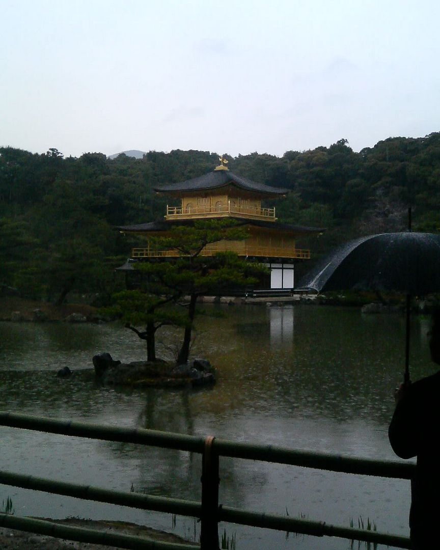 kinkaku-ji, an unesco world heritage site. drenched in rain and obscured with dark clouds, the